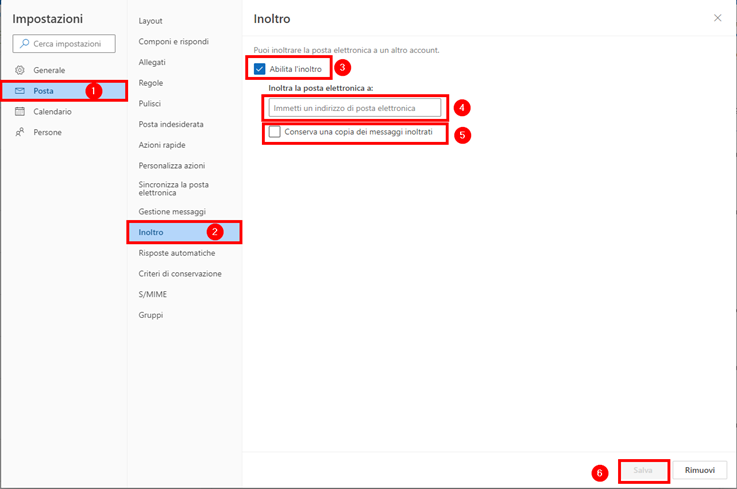 Inoltro” ( 3 ) e cliccare sul tasto Salva ( 6 ) in basso a Destra.